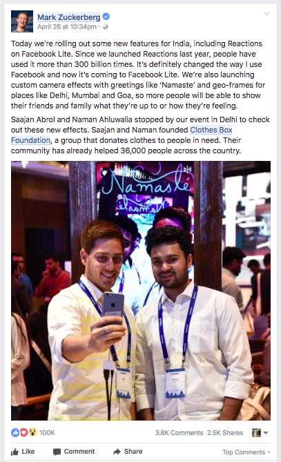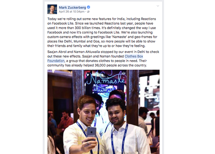 Mark Zuckerberg writes about Clothes Box Foundation on his personal facebook profile